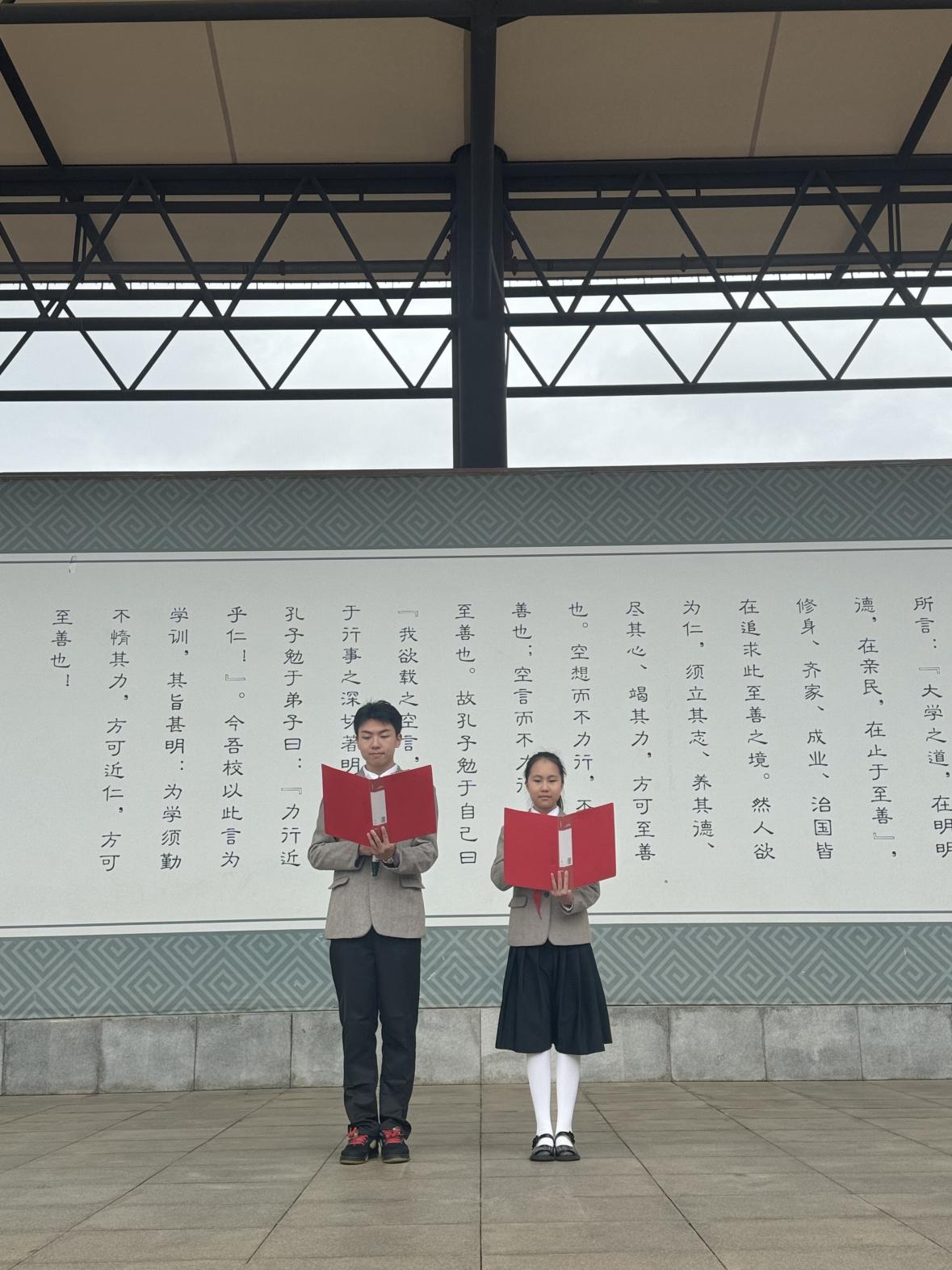激昂的国歌声响彻校园,五星红旗在校园上空冉冉升起。全体师生肃穆立正,飘扬的国旗与激昂的歌声交融,全体师生在庄严的仪式中感受家国情怀。